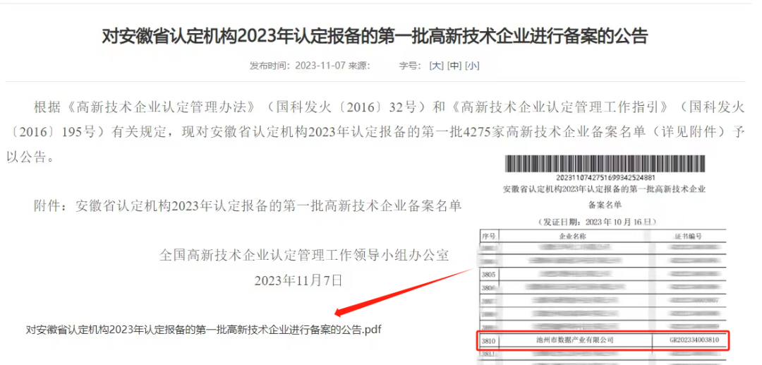 11月7日,全國高新技術(shù)企業(yè)認(rèn)定管理工作領(lǐng)導(dǎo)小組辦公室發(fā)布《對安徽省認(rèn)定機構(gòu)2023年認(rèn)定報備的第一批高新技術(shù)企業(yè)進(jìn)行備案的公告》,池州市數(shù)據(jù)產(chǎn)業(yè)有限公司名列其中,榮獲2023年度第一批認(rèn)定的高新技術(shù)企業(yè)。